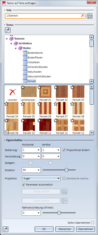 Ist die oben genannte Checkbox inaktiv, dann kann die Textur durch einen Klick auf diese Schaltfläche übernommen werden. Das Dialogfenster bleibt weiterhin geöffnet, so dass Sie direkt weiteren Teilen eine Textur zuweisen können. |
