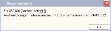 Ist der Austausch für alle Teile eindeutig möglich, dann wird er automatisch durchgeführt. Ist dies nicht der Fall, dann wird das Ergebnis der Prüfung in einem Protokoll im Dialogfenster Bauteilaustausch angezeigt, z. B.
