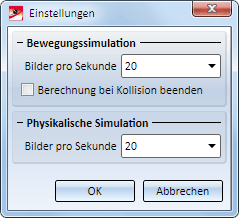 Ist die Checkbox Berechnung bei Kollision beenden aktiv, dann wird die Berechnung der Bewegungssimulation bei der ersten Kollision zweier Bauteile beendet. In diesem Fall erscheint ein Dialog und die betroffenen Bauteile werden markiert. Ist diese Option nicht gesetzt, dann werden Kollisionen in der Bewegungssimulation nicht berücksichtigt.