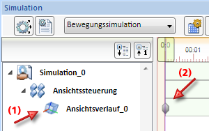 1. Um einen neuen Ansichtsverlauf anzulegen, wählen Sie im Kontextmenü der Ansichtssteuerung die Funktion Neuen Ansichtsverlauf anlegen. In den Strukturbaum der Simulation wird der neue Ansichtsverlauf als Untereintrag (1) der Ansichtssteuerung und die aktuelle Ansichts als Schlüsselpunkt zum Zeitpunkt Null in die Zeitleiste eingetragen.