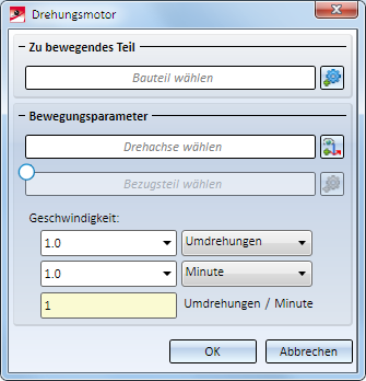 Drehungsmotor Der Drehungsmotor rotiert ein Bauteil mit einer bestimmten Geschwindigkeit um eine vorgegebene Achse .Wird die Geschwindigkeit negativ angegeben, dann bewegt sich das Teil in die entgegengesetzte Richtung.