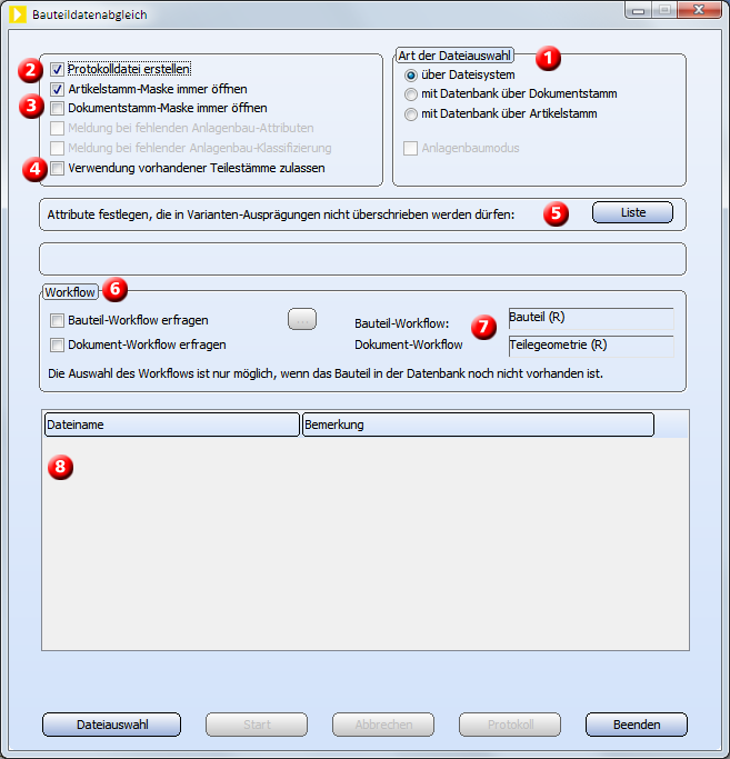 Wenn das jeweilige Bauteil schon in der Datenbank existiert, stehen auch die Workflow-Namen dafür fest. Wenn es noch keine voreingestellten Workflow-Namen gab, werden sie von dem Bauteil übernommen und unter (6) angezeigt.