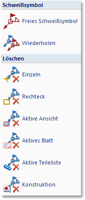 - Die Funktion steht auch unter 3D-Bemaßung + Text > Symbole > Schw... zur Verfügung. Im Pulldown-Menü der Funktionn finden Sie dann auch Funktionen zum Löschen und Wiederholen von Schweißsymbolen.