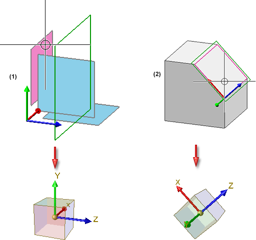 Beispiele eines Teilekoordinatensystems: (1) Auswahl einer Standard-Ebene, (2) Auswahl einer beliebigen Ebene