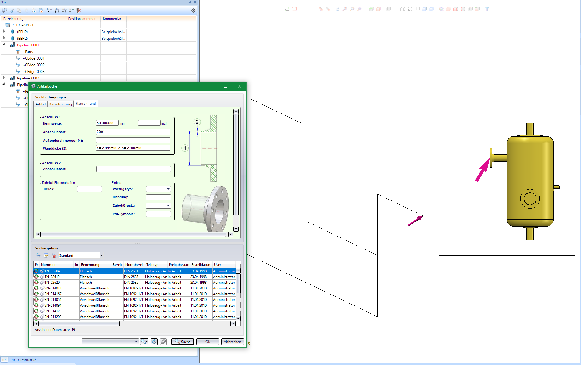 Die Suchbedingungen für den anzuschließenden Flansch richten sich immer nach dem Flanschanschluss, an den angeschlossen werden soll. Das bedeutet, dass die für die Rohrleitung oder den Leitkantenzug vereinbarte Nennweite hierbei immer ignoriert wird, also auch dann, wenn die Einstellung Nennweite ignorieren nicht gesetzt ist.