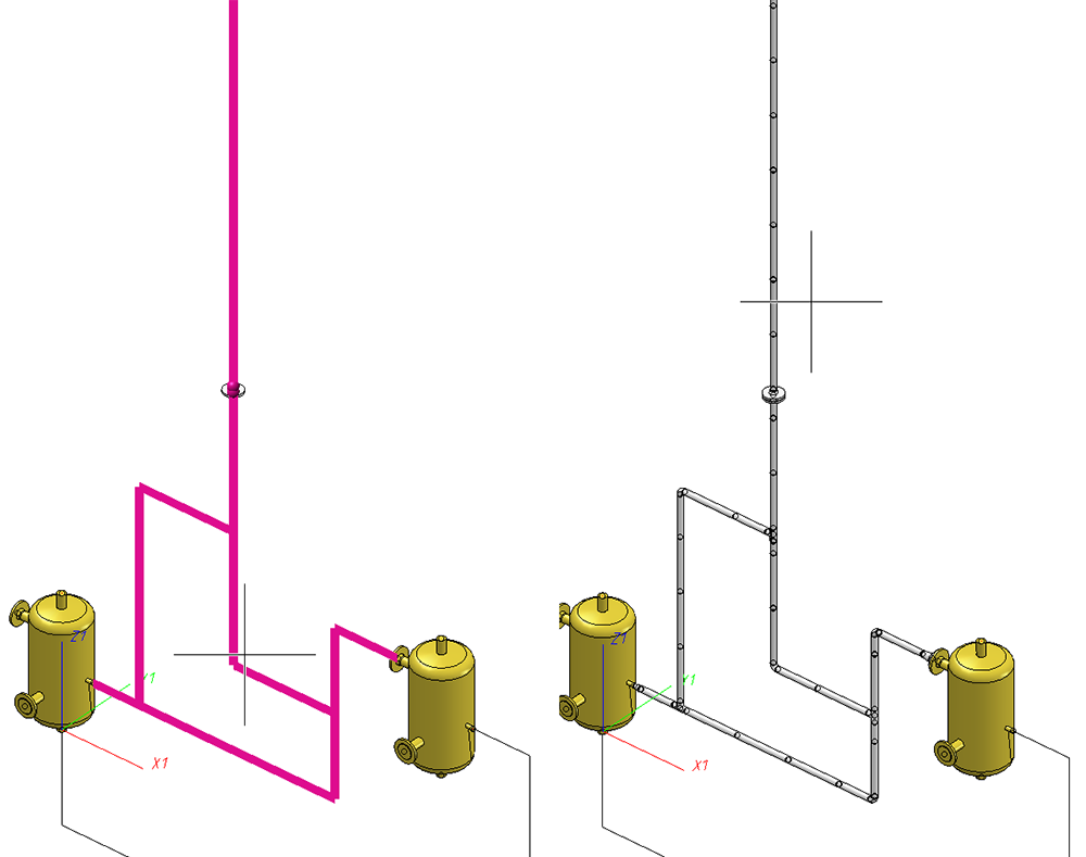 Diese Option bietet die Möglichkeit, mehrere aneinander anschließende Rohrleitungen als Rohrleitungsverbund zu betrachten und in einem Schritt zu belegen. Nach dem Verlassen des Dialogfensters mit OK fordert HiCAD Sie den Rohrleitungsverbund auszuwählen. In der folgenden Abbildung (links) beginnt an dem einzelnen Flansch eine neue Rohrleitung.