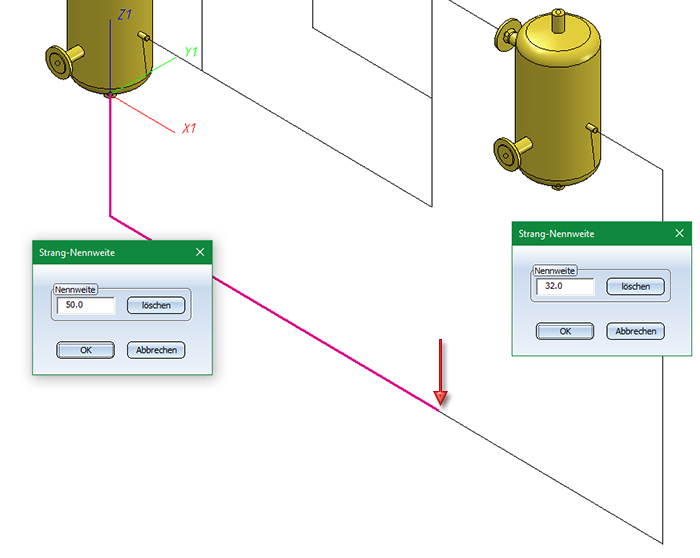 Wenn der aktiven Rohrleitung eine Nennweite zugeordnet ist oder zumindest für die Leitkantenzüge dieser Rohrleitung Nennweiten festgelegt sind, dann wird an jeden Bauteilanschluss, dessen Nennweite von der an seinem Einbauort geltenden Nennweite abweicht, ein passendes Reduzierstück angeschlossen. Ist der Rohrleitung eine Rohrklasse zugeordnet, muss diese Rohrklasse die passenden Reduzierungen enthalten.