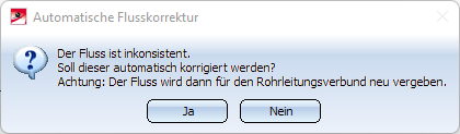 Bei Wahl von Ja wird der Fluss von HiCAD automatisch neu vergeben, d. h. überschrieben. Anschließend beginnt der Eingabedialog von vorne. Bei Wahl von Nein, wird die Stelle, an der die Inkonsistenz besteht, mit einem Pfeil markiert.