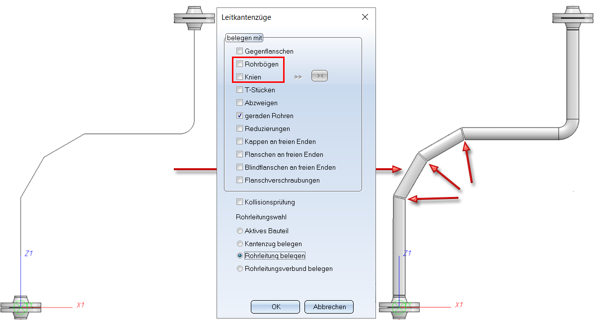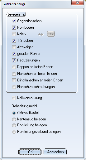 Sollen alle Leitkantenzüge einer Rohrleitung belegt werden, dann aktivieren Sie diese Option. Nach dem Verlassen des Dialogfensters mit OK fordert HiCAD Sie auf, die gewünschte Rohrleitung auszuwählen.