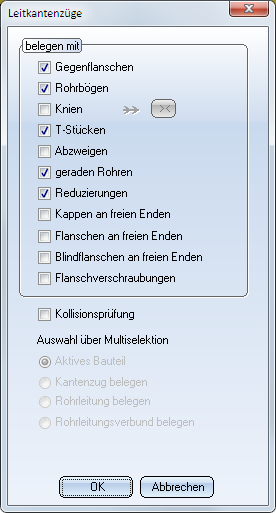 Sind mehrere Bauteile selektiert, von denen mindestens eines unterhalb einer Rohrleitung liegt, so werden die anderen Optionen ausgegraut und die zu belegenden Elemente werden über die Multiselektion bestimmt. Analog zu der Selektion über das aktive Bauteil werden dabei Leitkantenzüge einzeln belegt und für jedes andere ausgewählte Bauteil die übergeordnete Rohrleitung.