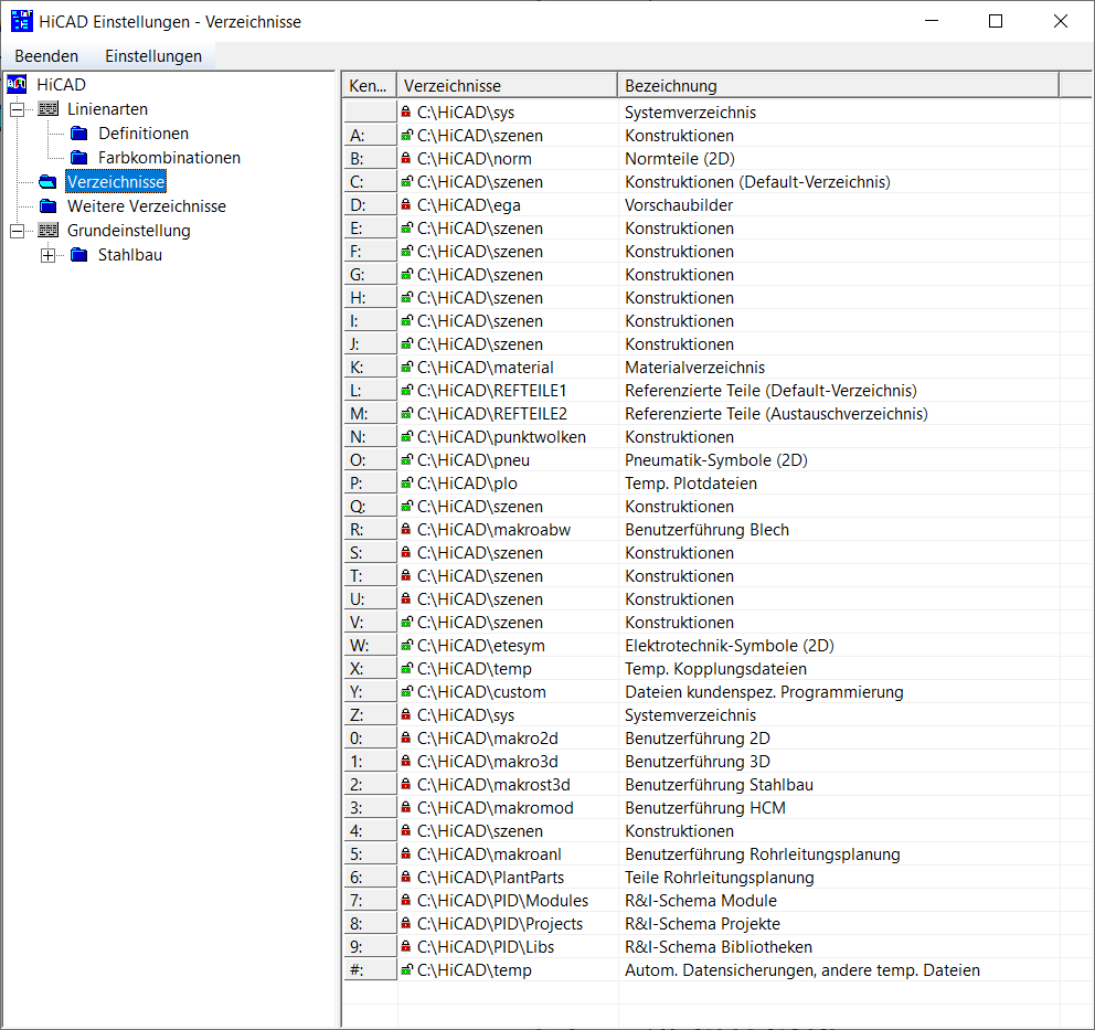Die beim Verlassen des Menüs Einstellungen eingetragenen Verzeichnisse bleiben auch beim Beenden von HiCAD erhalten, d. h. sie sind beim nächsten Start von HiCAD die Default-Einstellungen. Diese Einstellungen werden in der Datei FILEGRUP.DAT gespeichert.