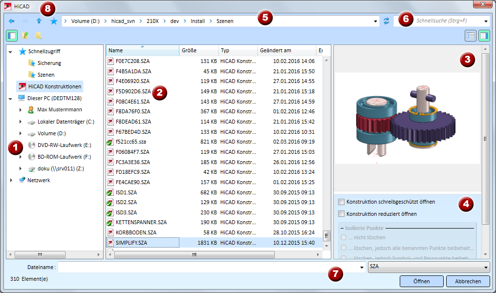 Der HiCAD-Dialog beim Laden/Speichern von Dateien orientiert sich im Wesentlichen an Microsoft Windows 10 und soll hier beispielhaft für das Laden von Konstruktionen mit der Funktion Konstruktion > Neu/Öffnen > Öffnen