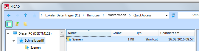 Intern funktioniert der Schnellzugriff so, dass angeheftete Ordner als normale Windows-Verknüpfungen im dem von HiCAD angelegten Verzeichnis %userprofile%\QuickAccess (resp. C:\Users\<benutzername>\QuickAccess, resp. C:\Benutzer\<benutzername>\QuickAccess) gespeichert werden. |