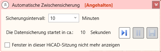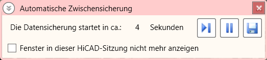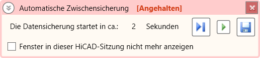 Kurz vor Ablauf des Zeitintervalls blendet HiCAD in der aktuellen Konstruktion das Dialogfenster Automatische Zwischensicherung ein: