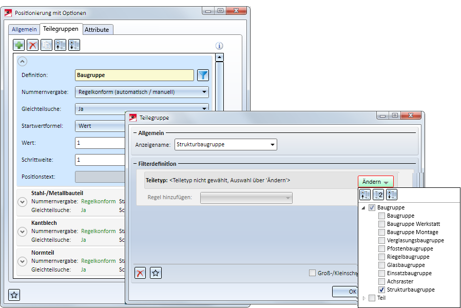 Hier bestimmen Sie, welche Teiletypen zu der Teilegruppe gehören sollen.