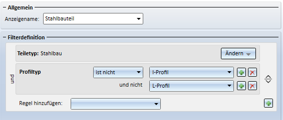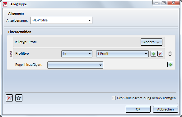- Da diese Teilegruppe nur für I- und L-Profile gelten soll, muss hier eine Regel hinzugefügt werden. Wählen Sie in der Listbox unter Eigenschaften den Eintrag Profiltyp. I-Profil ist dann voreingestellt.