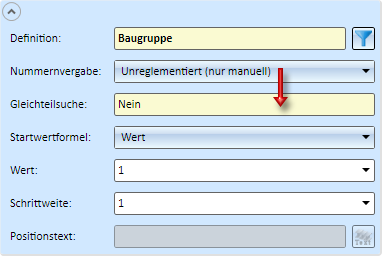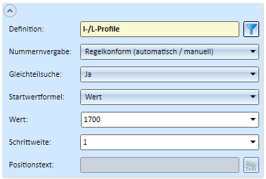 Der Startwert wird zur Zeit durch einen festen Wert bestimmt, den Sie darunter liegenden Eingabefeld bestimmen. Neue Positionsnummern werden durch die Formel Startwert + Schrittweite * n bestimmt.