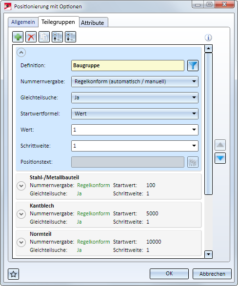 Die Positionierung unterstützt frei konfigurierbare Teilegruppen. Welche Teiletypen zu einer Teilegruppe gehören lässt sich über die Teilefilter festlegen. Darüber hinaus lässt sich hier - falls unter Allgemein die Generierung von Positionstexten gewählt wurde - für jede Teilegruppe die Konfiguration der Positionstexte individuell festlegen.