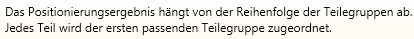 Das Positionierungsergebnis wird durch die Reihenfolge der Teilegruppen beeinflusst, indem jedes Teil der ersten passenden Teilegruppe zugeordnet wird (siehe auch Beispiel 1 und Beispiel 2). Die Reihenfolge der Positionsnummernvergabe selbst hängt jedoch ausschließlich von den auf der Registerkarte Teileattribute gewählten Sortierkriterien ab. Sind dort keine Unterscheidungs-/Sortierkriterien definiert, dann wird zur Vergabe der Positionsnummern einfach die Teilestruktur durchlaufen.