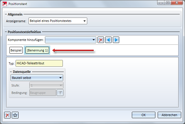Dieses Feld ist nur aktiv, wenn auf der Registerkarte Allgemein die Checkbox Positionstexte generieren aktiv ist. Positionstexte können aus freien Texten und Attributen aus verschiedenen HiCAD/HELiOS-Quellen bestehen.