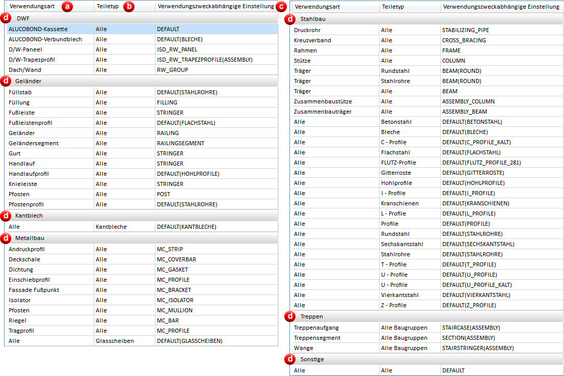 a) Verwendungsart, b) Teiletyp, c) zugeordnete Verwendungszweckabhängige Einstellung, d) Gruppe