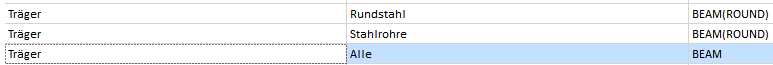 Hier wird der Verwendungsart Träger die Konfiguration BEAM (ROUND) zugeordnet, wenn der Teiletyp Rundstahl oder Stahlrohre ist. Allen anderen Teiletypen wird die Konfiguration BEAM zugeordnet.