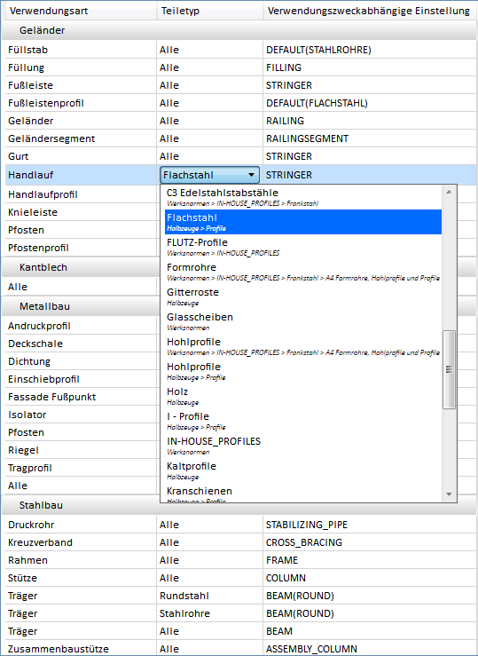 Soll beispielsweise nur Handläufen vom Typ Flachstahl die Verwendungszweck-abhängige Einstellung STRINGER zugeordnet werden, dann wählen Sie unter Teiletyp den Eintrag Flachstahl.