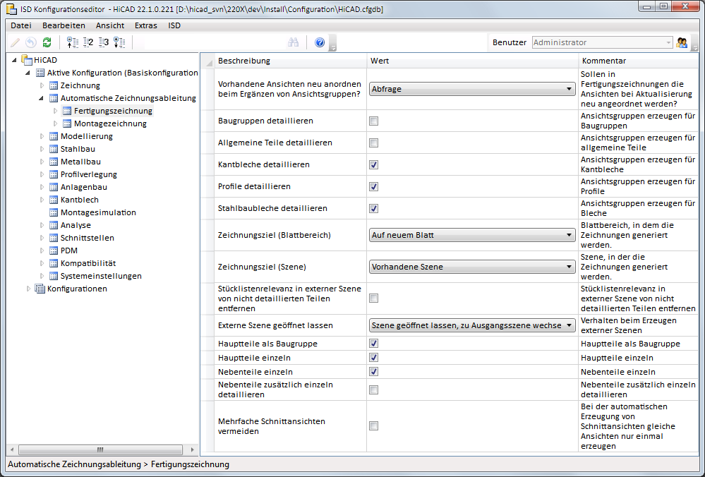 Alle für die Erstellung der Einzelteil-/Werkstattzeichnungen relevanten Einstellungen werden im ISD-Konfigurationsmanagement vorgenommen und in den Konfigurationsdatenbank HICAD.cfgdb im Verzeichnis CONFIGURATION der HiCAD Installation gespeichert. Diese Datenbank oder einzelne Bereiche lassen sich im- und exportieren. Die Einstellungen für Einzelteil-/Werkstattzeichnungen finden Sie dort unter Automatische Zeichnungsableitung > Fertigungszeichnung.