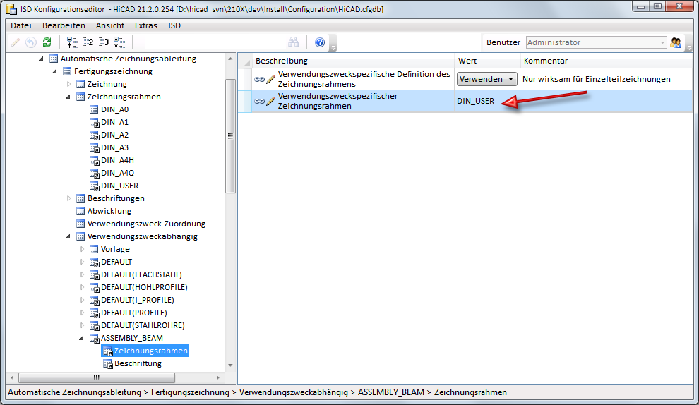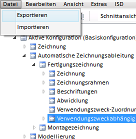 Beispielsweise ist dort ISD-seitig der Verwendungsart Geländer die Konfiguration RAILING zugeordnet, der Vewendungsart Handlauf die Konfiguration STRINGER etc. Die Konfigurationen selbst liegen unter Automatische Zeichnungsableitung > Fertigungszeichnung > Verwendungszweckabhängig, z. B. die Konfiguration RAILING.