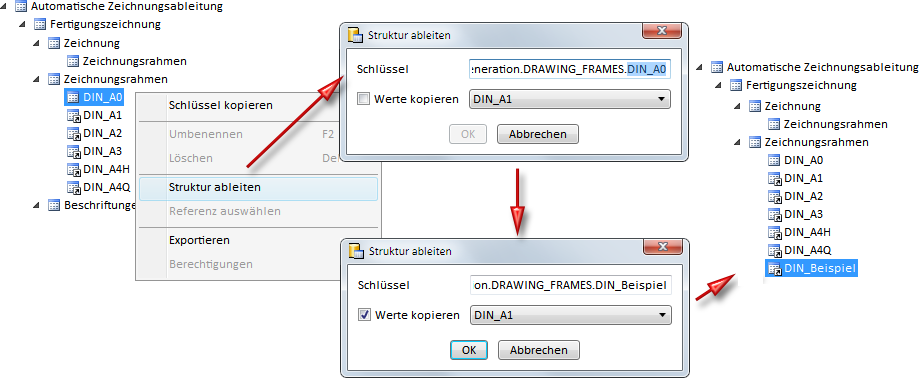 Ersetzen Sie im Feld Schlüssel den String DIN_A0 durch den Namen des neuen Zeichnungsrahmens, z. B. DIN_Beispiel.Wollen Sie für diesen Rahmen Einstellungen anderer Rahmen kopieren, dann aktivieren Sie Checkbox Werte kopieren.