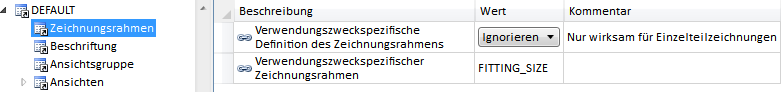 - Verwendungszweckspezifische Zeichnungsrahmen lassen sich nur für Einzelteilzeichnungen verwenden. In diesem Fall werden die eingestellten verwendungszweckabhängigen Einstellungen des obersten stücklistenrelevanten Bauteils ausgelesen. Falls es sich um eine Werkstattzeichnung handelt (mehrere Bauteile in einer Zeichnung), dann wird die allgemeine Einstellung für Zeichnungsrahmen unter Automatische Zeichnungsableitung > Fertigungszeichnung > Zeichnungsrahmen ausgelesen.
