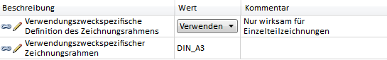 Für Einzelteilzeichnungen lassen sich auch verwendungszweckabhängige Zeichnungsrahmen festlegen. Dazu kann unter Verwendungszweckabhängig für den jeweiligen Bereich der Zeichnungsrahmen für diesen Verwendungszweck definiert werden.
