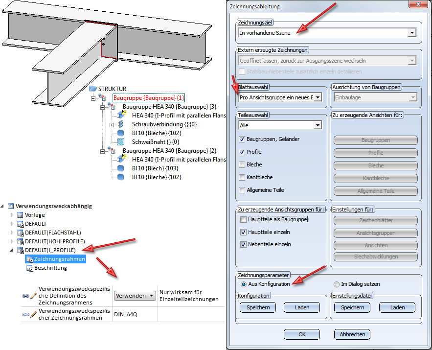 Die Abbildung zeigt eine Konstruktion bestehend aus zwei durch einen Anschluss verbundenen I-Profilen (HEA) und die zugehörige Teilestruktur. Im Konfigurationsmanagement ist für I-Profile ein verwendungszweckspezifischer Zeichnungsrahmen (DIN_A4Q) gewählt worden. Wird mit den abgebildeten Einstellungen und Optionen die Zeichnungsableitung ausgeführt, dann wird nur für die Einzelteilzeichnungen der Profile der im Konfigurationsmanagement unter DEFAULT(I_PROFILE) gewählte Zeichnungsrahmen verwendet, also DINA4Q.