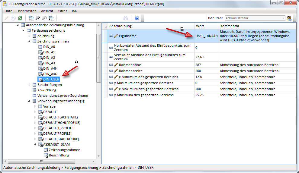 Beachten Sie dabei bitte, dass Sie dort unter Verwendungszeckspezifischer Zeichnungsrahmen den in der Struktur unter Zeichnungsrahmen angegebenen Namen (A) und nicht den Namen der Figurendatei (B) angeben müssen.