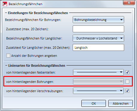 1. In den Einstellungen für Bemaßungen muss für hintenliegende Bezeichnungsfähnchen die Linienart ausgeschaltet sein.