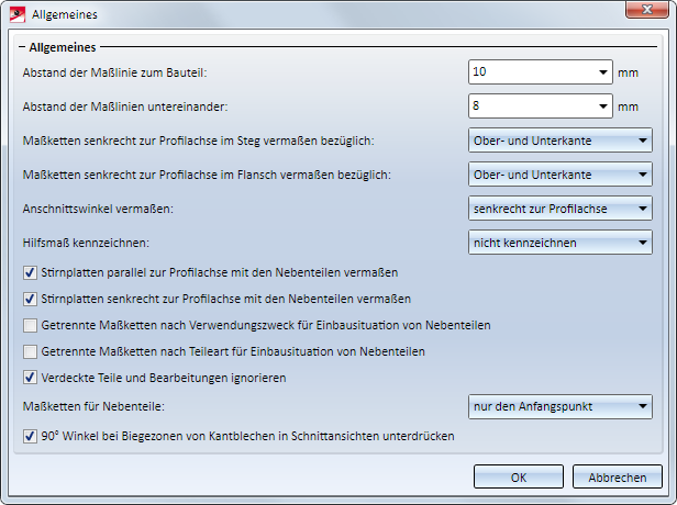 In den Einstellungen für Bemaßungen lässt sich unter Allgemeines festlegen, dass die Anbauteile (Profile) in den unterschiedlichen Maßketten abhängig von dem Attribut Teileart bemaßt werden. Dazu steht im Dialogfenster eine entsprechende Checkbox zur Verfügung. Auf diese Weise ist es möglich, Hohlprofile / Anbauteile getrennt von Rundstahl /Anbauteil zu bemaßen und so die Strukturierung der Maße zu verbessern.