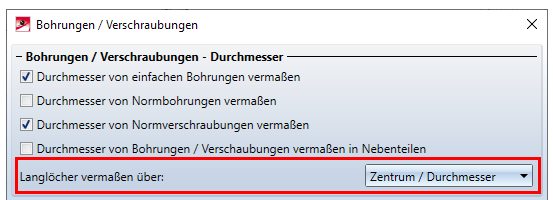 In den Einstellungen für Bemaßungen lässt sich unter Bohrungen / Verschraubungen jetzt auch festlegen, dass getrennte Maßketten für Bohrungen (Durchgangs- und Normbohrungen) und Ausnehmungen getrennt erzeugt werden. Dazu steht die Checkbox Maßketten für Bohrungen und Ausnehmungen trennen zur Verfügung.