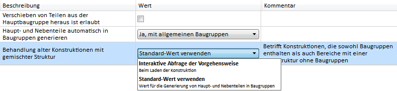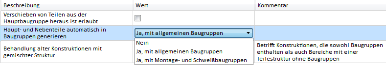 Haben Sie also beispielsweise den Parameter auf NEIN gesetzt, dann erhält eine Konstruktion beim Neuanlegen diese Kennung. Dies bedeutet, dass auch bei den oben genannten Automatismen diese Struktur verwendet wird! Auch bei einer nachträglichen Änderung des Parameters im Konfigurationsmanagement bleibt die Kennung der Konstruktion unverändert. Sie können zwar die Baugruppenfunktionalität manuell verwenden, bei den Automatismen wird sie jedoch nicht berücksichtigt.