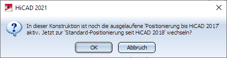 Sobald Sie in Konstruktionen, die mit einer früheren HiCAD Version erstellt und dort - zumindest teilweise - mit dem alten Positionierungsmodus positioniert wurden, eine der Positionierungsfunktionen aufrufen, erscheint die folgende Meldung: