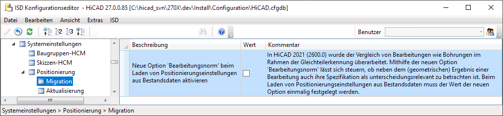 Um bei der Migration von Bestandsdaten "Überraschungen" bei Bohrungen zu vermeiden, steht im Konfigurationsmanagement unter Systemeinstellungen > Positionierung > Migration der neue Schalter Neue Option 'Bearbeitungsnorm' beim Laden von Positionierungseinstellungen aus Bestandsdaten zur Verfügung.