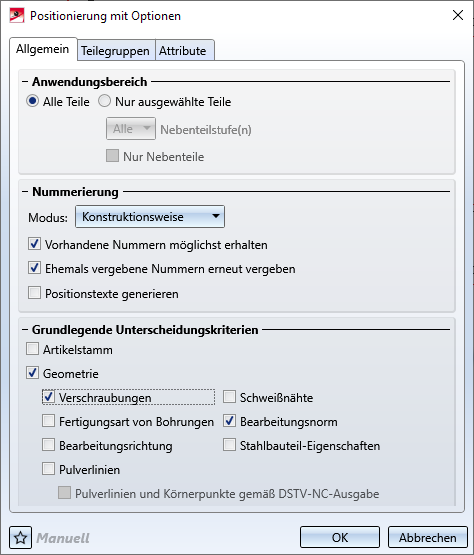 Mit einem Klick auf OK wird der Dialog der Standard-Positionierung gestartet. Dort können Sie die Einstellungen prüfen, noch nicht vorhandene Positionsnummern generieren etc.