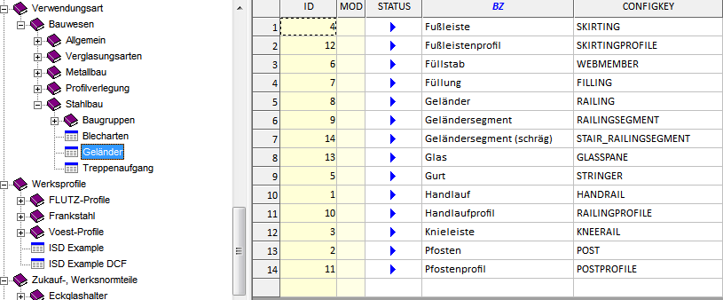 Beispielsweise ist dort ISD-seitig der Verwendungsart Geländer die Konfiguration RAILING zugeordnet, der Vewendungsart Handlauf die Konfiguration STRINGER etc. Die Konfigurationen selbst liegen unter Automatische Zeichnungsableitung > Fertigungszeichnung > Verwendungszweckabhängig, z. B. die Konfiguration RAILING.