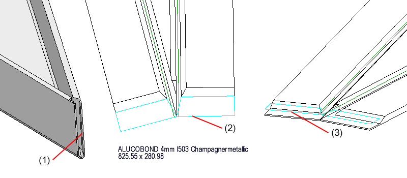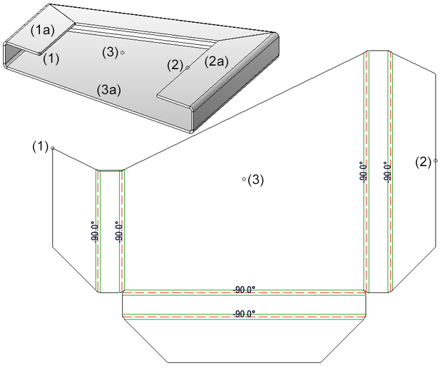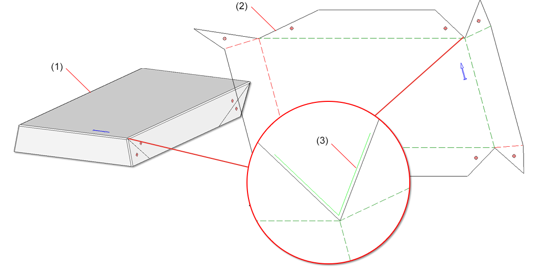 (1) Blechteil, (2) Abwicklung, (3) Vergrößerung der Bahn für die spitze Innenkanten mit einer Bahnlänge von 0,3