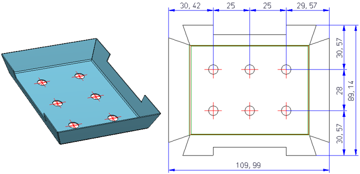 Das Ausgangsblech enthält Bohrungen, deren Achsenkreuze rot dargestellt werden. Jetzt wählen Sie im Dialog als Farbe für die Achsenkreuze blau. Damit diese bei der Abwicklung auch blau dargestellt werden, müssen Sie hier den Haken setzen. Anderenfalls werden die Achsenkreuze wie im Ausgangsblech rot dargestellt.