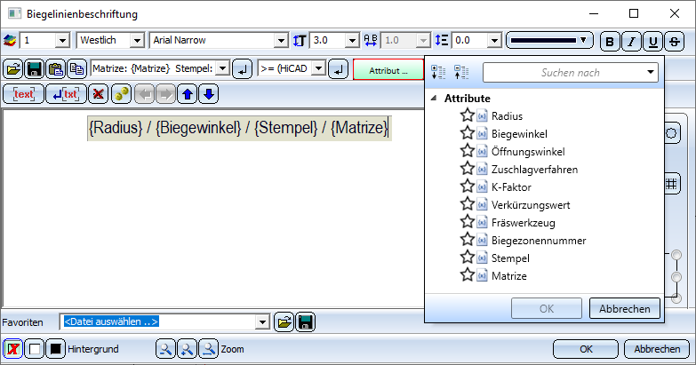 Hier konfigurieren Sie die Beschriftung der Abwicklung (die Biegelinien, Bombierungen und Stanzen). Ferner können Sie Zusatztexte, z. B. für die Fertigung, definieren. Sie können entweder manuell, mit Hilfe des Beschriftungseditors, die Texte definieren oder die Beschriftung für Bystronic oder LVD über die Favoriten
