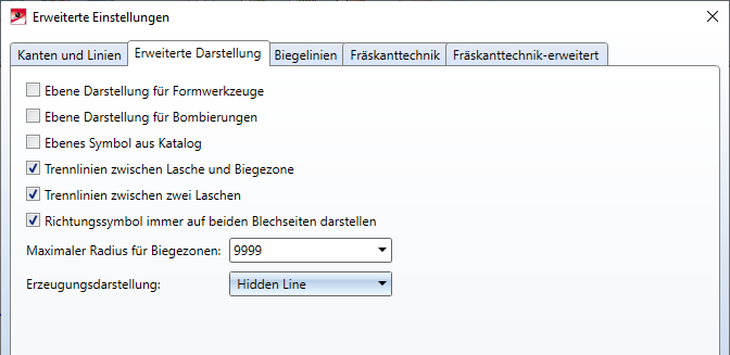 Die Biegelinie und Biegezone können unter Darstellung aktiviert bzw. deaktiviert werden. Länge, Abstand zur Außenkontur, Linienart und Farbe stellen Sie unter Erweiterte Einstellungen