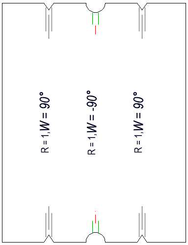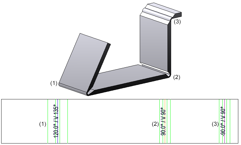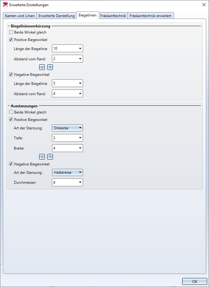 Die Biegelinie kann anstatt einer durchgehenden Linie auch durch zwei kurze Linien am Anfang und Ende der Biegekante dargestellt werden. Ferner können der Anfang und das Ende durch eine Stanzung gekennzeichnet werden. Auch hier besteht die Möglichkeit für den positiven und den negativen Winkel unterschiedliche Werte einzustellen.