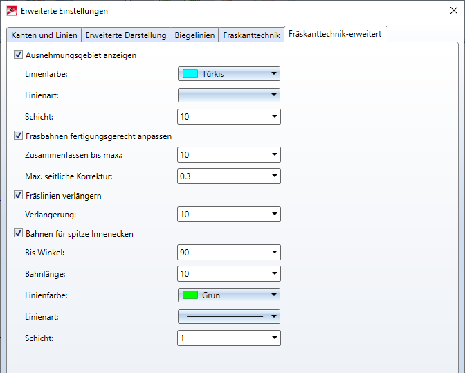 Bahnen für spitze Innenecken. Geben Sie dann ein bis zu welchen Winkel die Bahn erzeugt werden soll. Die Bahnlänge, Schicht, Farbe und den Linientyp können Sie ebenfalls einstellen.