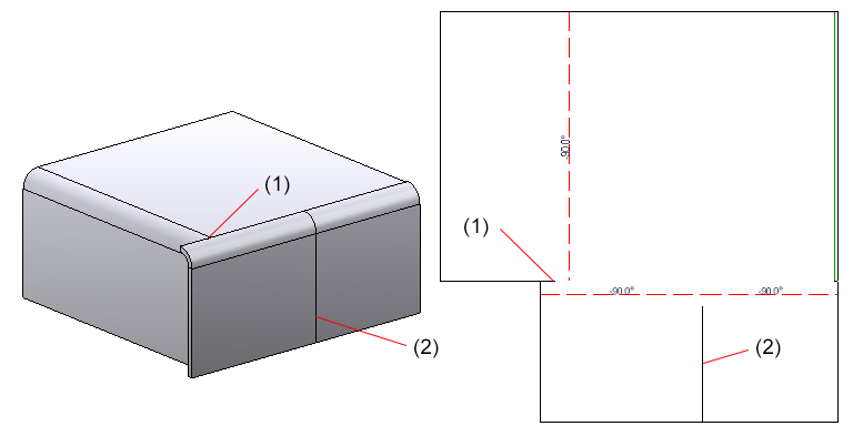 Wenn sich zwei Laschen bei der Abwicklung ohne Schnittluft berühren, wird eine Linie als Trennschnitt in die Abwicklung eingeführt. Stößt die Stirnfläche einer Biegezone direkt an eine Lasche, so wird auch hier eine Trennschnittlinie eingefügt.