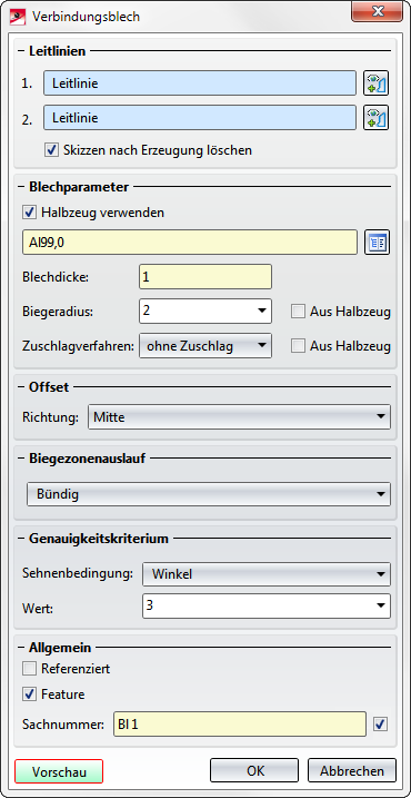aus dem Katalogeditor von HiCAD übernehmen. Die Auswahl eines Halbzeugs beeinflusst nicht nur die Blechdicke, sondern auch den Biegeradius, das Zuschlagverfahren und die Sachnummer. Ist Halbzeug aktiv kann die Blechdicke nicht mehr geändert werden, Biegeradius, Sachnummer und Zuschlagverfahren hingegen schon. Mit einem Doppelklick auf das Feature Verbindungsblech können Sie auch später noch das Halbzeug aktivieren/deaktivieren oder ändern.